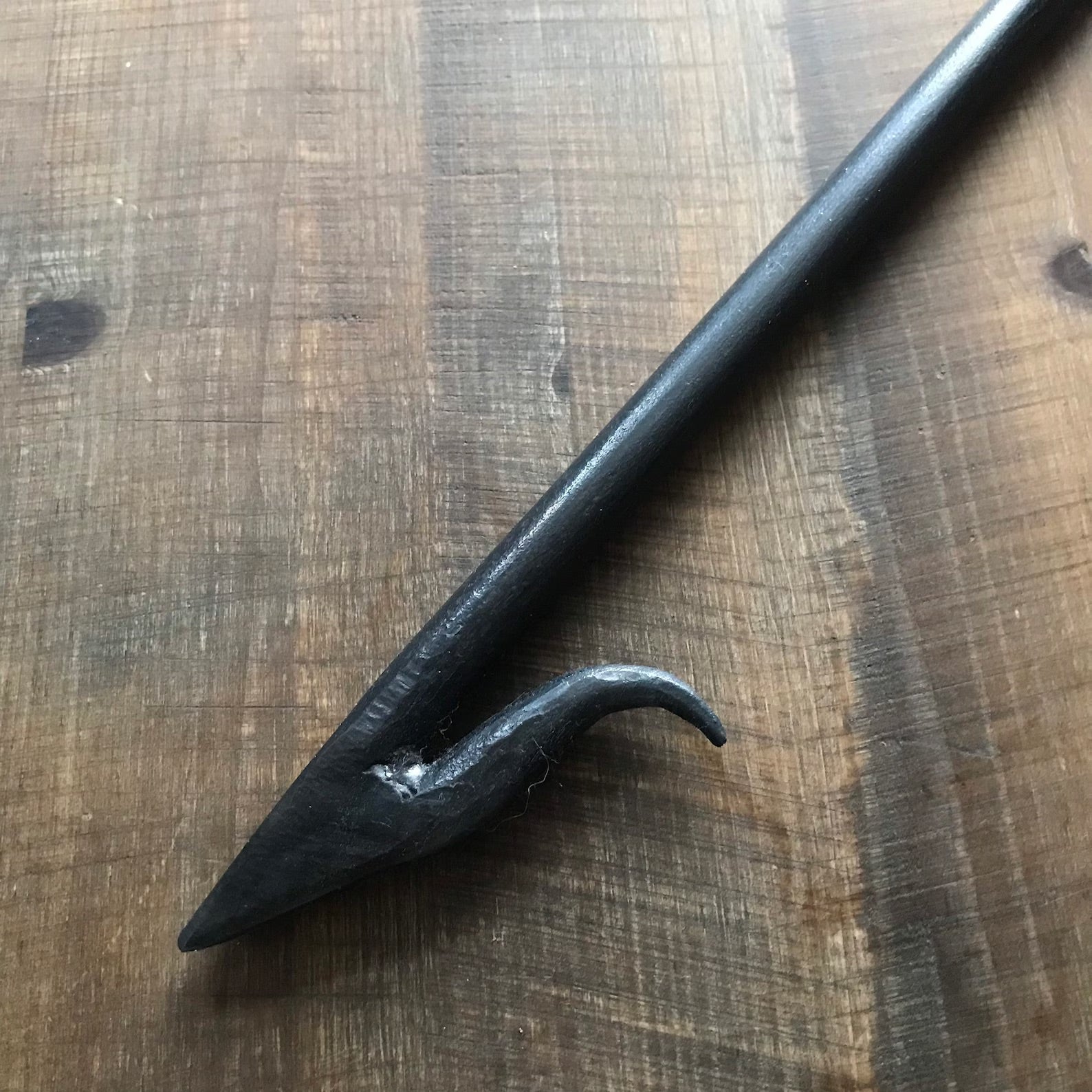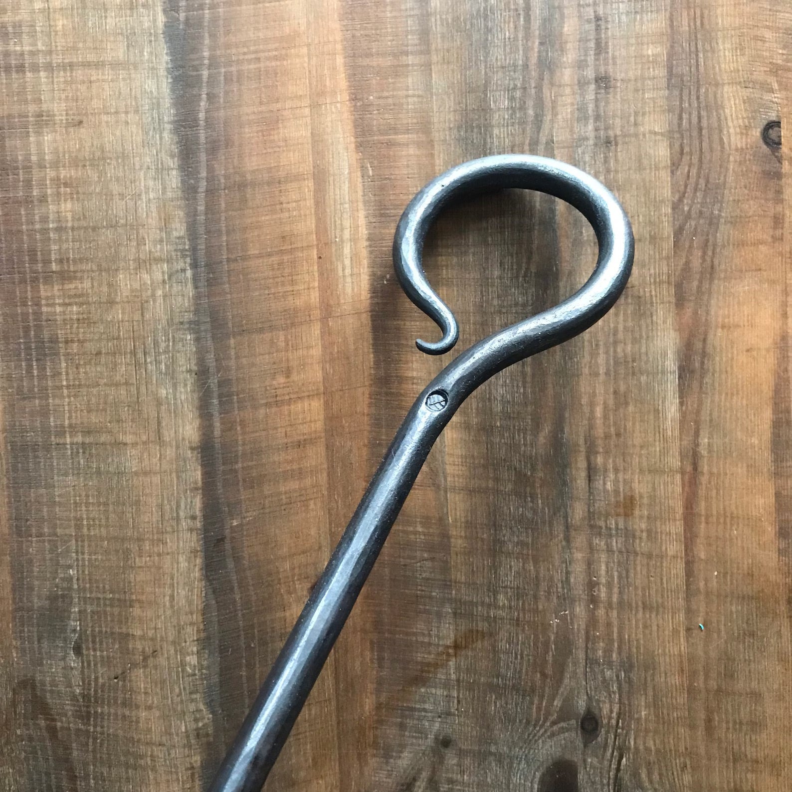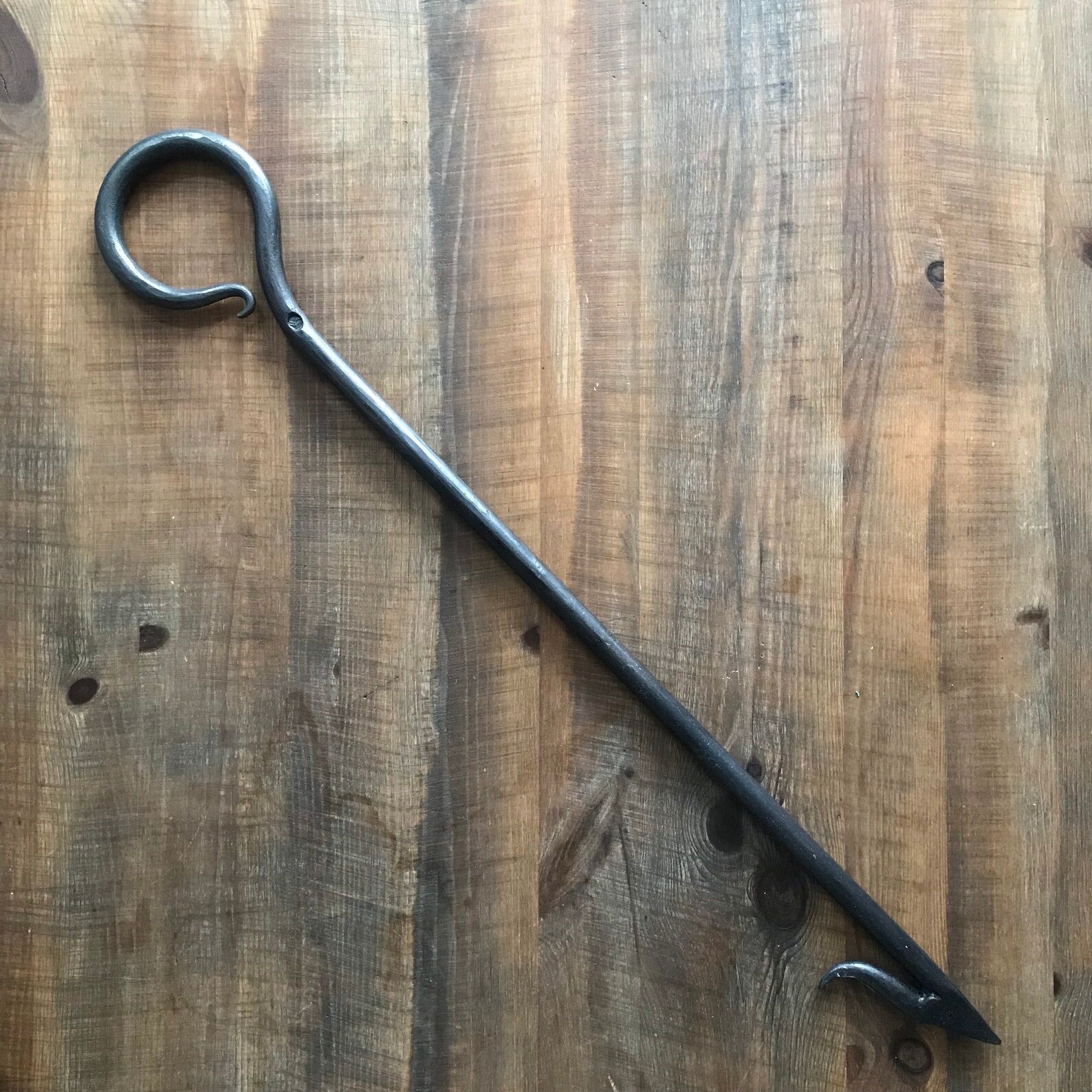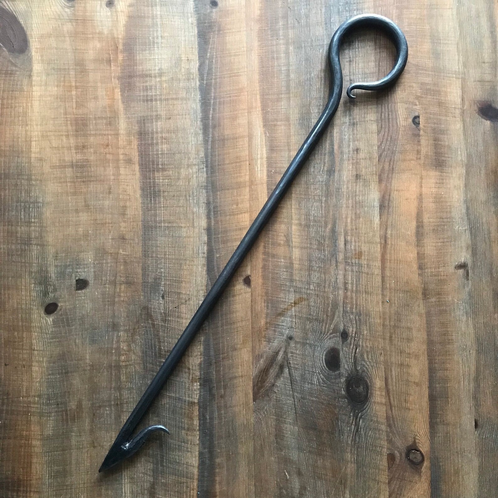 These fire pokers are made from 10mm round bar, and feature a loop handle and log turning barb. They measure roughly 550mm in length and are finished with oil while hot for a smooth black finish.